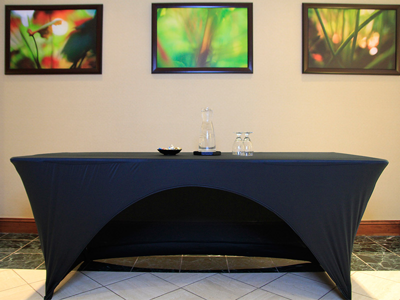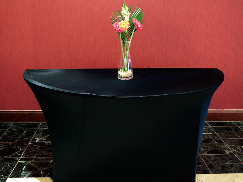 This is our "half moon" display or serving TABLE SLEEVE. Enhance your table presentation or table setting with a wide variety of colors we offer. Our display or serving TABLE SLEEVE is also offered, upon request, with a "fire retardant" finish on our fabrics....